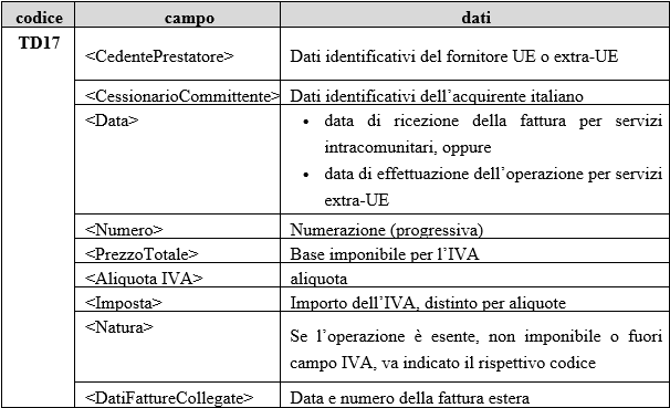 • Codice TD17 (prestazioni servizi ricevute UE ed extra-UE),
